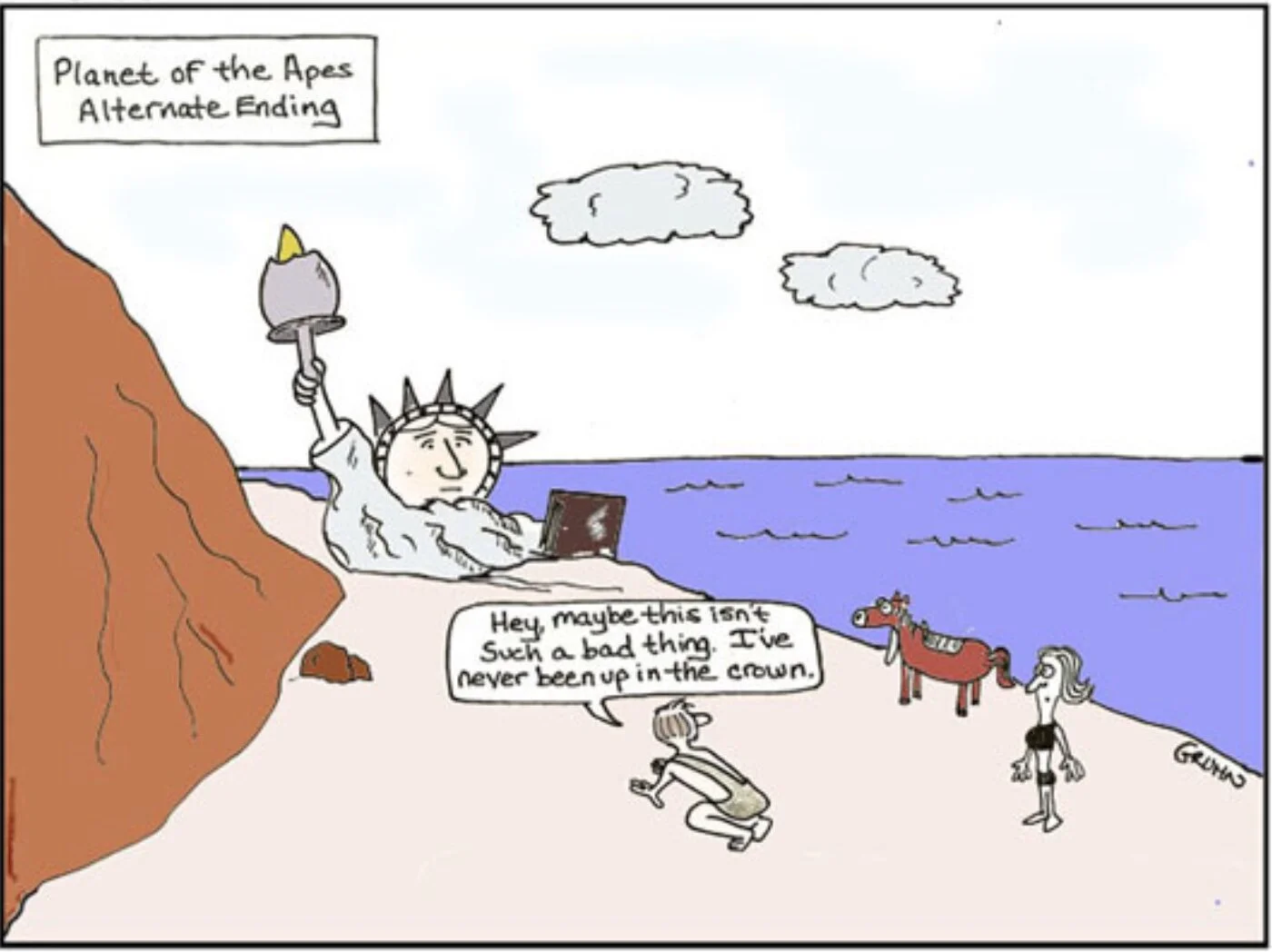 And at this point is is always tempting to show the original ending to Planet of the Apes to illustrate how man can catastrophically reverse and relapse, but in the spirit of the double-edged topic, let’s have another cartoon version where some mass tourism can still come into play.
